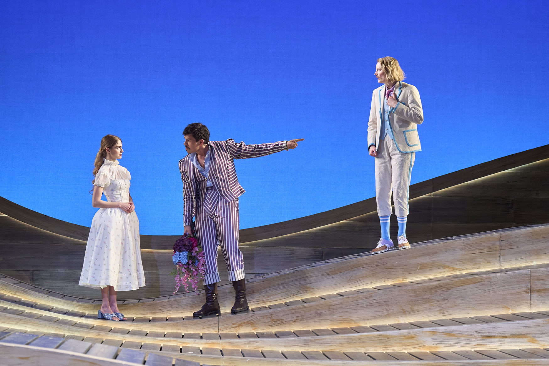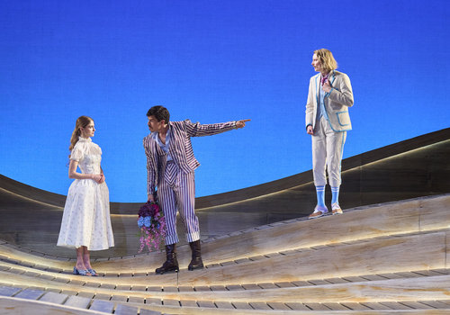 Orsino (actor, Jeremy Gallardo*) admonishes Olivia (actor, Ángela Utrera*) for rebuking his love as Cesario (actor, Grayson Heyl*) watches in the Great Lakes Theater production of Twelfth Night at the Hanna Theatre, Playhouse Square, running through April 6. (Photo by Roger Mastroianni) *Member Actors' Equity Association, the Union of Professional Actors and Stage Managers in the United States