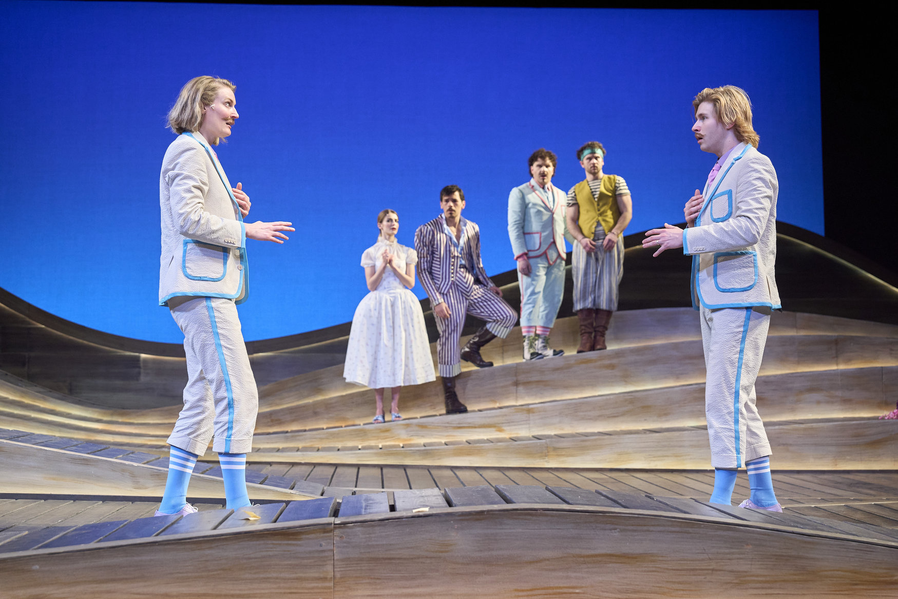 Viola (actor, Grayson Heyl*) and Sebastian (actor, Nic Scott Hermick*) are reunited as Olivia (actor, Ángela Utrera*), Orsino (actor, Jeremy Gallardo*), Valentine (actor, Boe Wank*) and Antonio (actor, Evan Stevens*) look on in shock in the Great Lakes Theater production of Twelfth Night at the Hanna Theatre, Playhouse Square, running through April 6. (Photo by Roger Mastroianni) *Member Actors' Equity Association, the Union of Professional Actors and Stage Managers in the United States