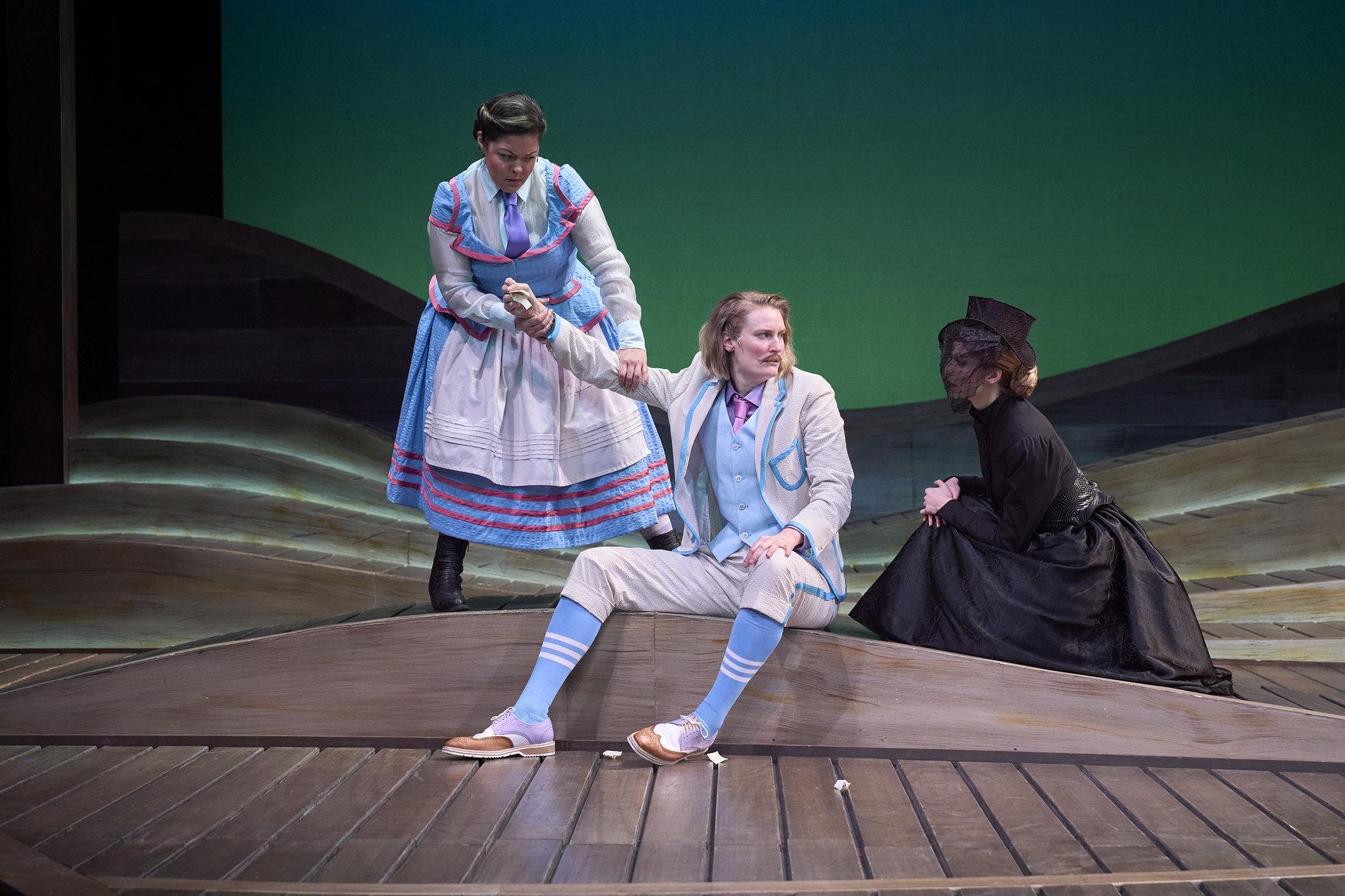 Maria (actor, Jessie Cope Miller*) distrusts Cesario (actor, Grayson Heyl*) as Olivia (actor, Ángela Utrera*) becomes interested in Orsino’s new messenger in the Great Lakes Theater production of Twelfth Night at the Hanna Theatre, Playhouse Square, running through April 6. (Photo by Roger Mastroianni) *Member Actors' Equity Association, the Union of Professional Actors and Stage Managers in the United States