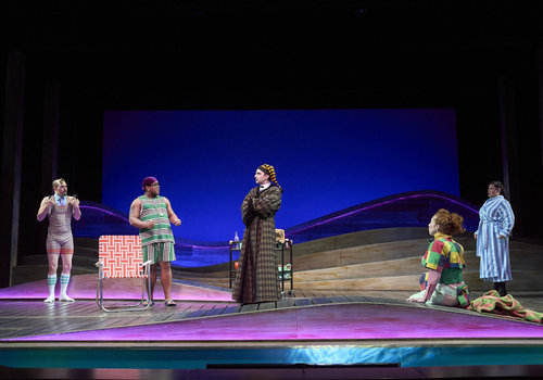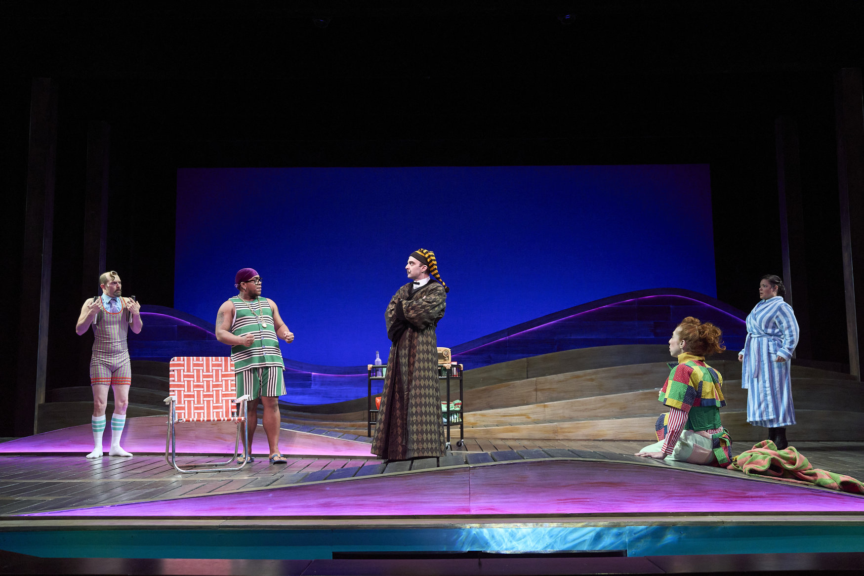 Olivia (actor, Ángela Utrera*) takes pity on Malvolio (actor, Joe Wegner*) as the plot Maria (actor, Jessie Cope Miller*) and Sir Toby Belch (actor, Dar’Jon Marquise Bentley) begins to unravel as Feste (actor, Theo Allyn*), Orsino (actor, Jeremy Gallardo*), Viola (actor, Grayson Heyl*) and Sebastian (actor, Nic Scott Hermick*) look on in the Great Lakes Theater production of Twelfth Night at the Hanna Theatre, Playhouse Square, running through April 6. (Photo by Roger Mastroianni) *Member Actors' Equity Association, the Union of Professional Actors and Stage Managers in the United States