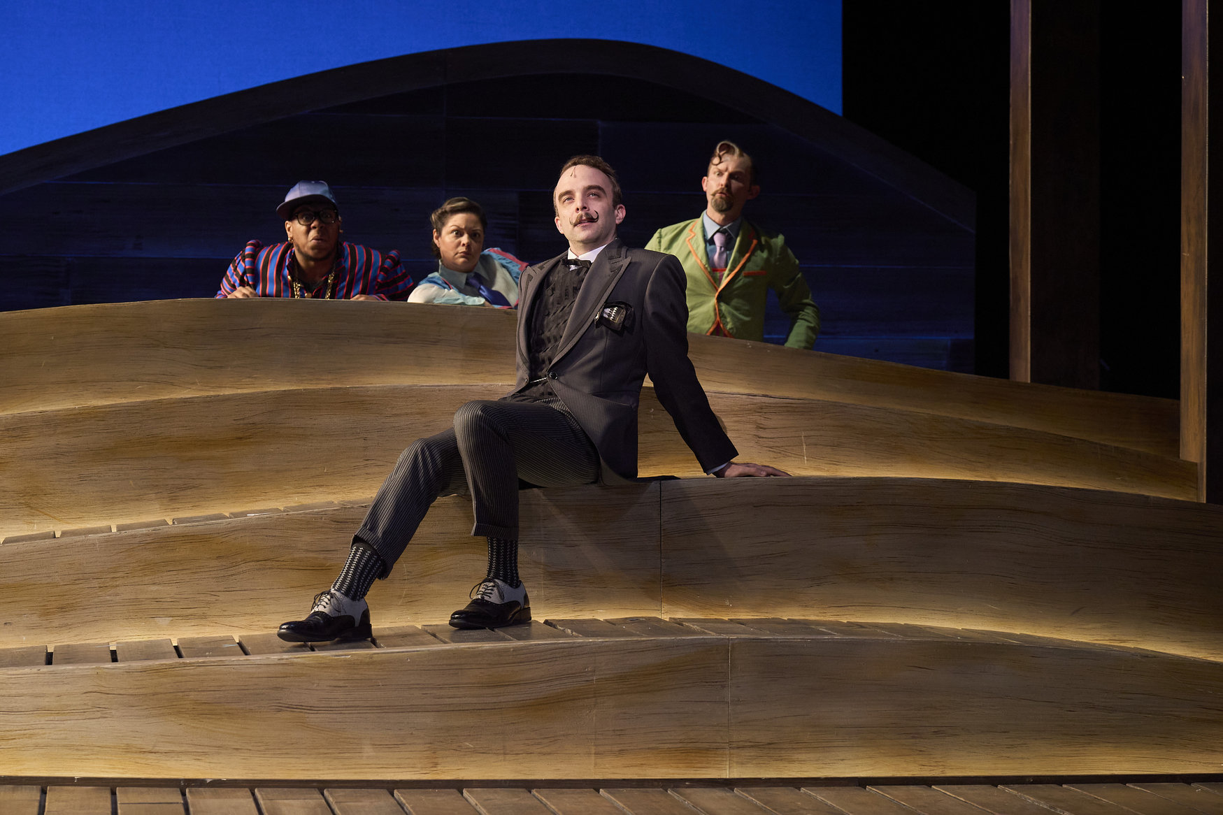 Malvolio (actor, Joe Wegner*) shares his disapproval of the late night revelry Sir Andrew Aguecheek (actor, James Alexander Rankin*), Sir Toby Belch (actor Dar’Jon Marquise Bentley), Feste (actor, Theo Allyn*) and Maria (actor, Jessie Cope Miller*) have in the Great Lakes Theater production of Twelfth Night at the Hanna Theatre, Playhouse Square, running through April 6. (Photo by Roger Mastroianni) *Member Actors' Equity Association, the Union of Professional Actors and Stage Managers in the United States