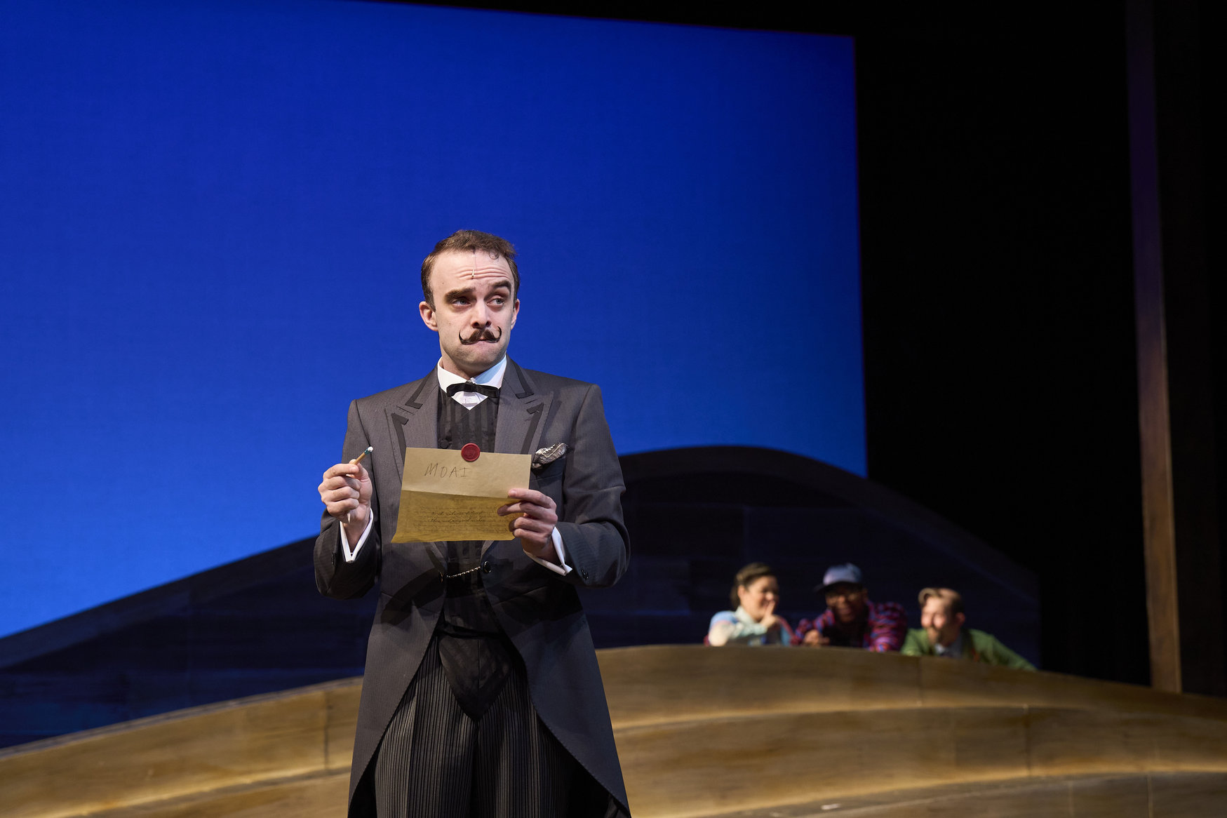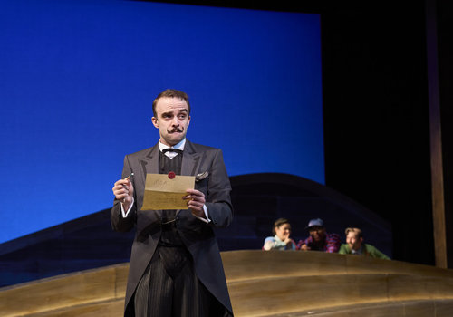Malvolio (actor, Joe Wegner*) reads a love letter as Sir Toby Belch (actor, Dar’Jon Marquise Bentley), Maria (actor, Jessie Cope Miller*) and Sir Andrew Aguecheek (actor, James Alexander Rankin*) watch their plot unfold in the Great Lakes Theater production of Twelfth Night at the Hanna Theatre, Playhouse Square, running through April 6. (Photo by Roger Mastroianni) *Member Actors' Equity Association, the Union of Professional Actors and Stage Managers in the United States