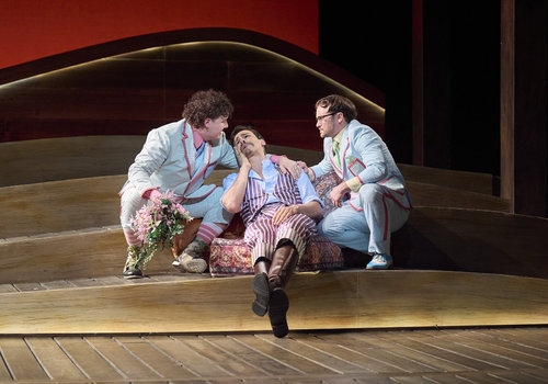 A heartbroken Duke Orsino (actor, Jeremy Gallardo) is consoled by Valentine (actor, Boe Wank*) and Curio (actor, Evan Stevens*) in the Great Lakes Theater production of Twelfth Night at the Hanna Theatre Playhouse Square, running through April 6. (Photo by Roger Mastroianni) *Member Actors' Equity Association, the Union of Professional Actors and Stage Managers in the United States