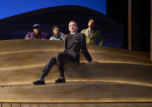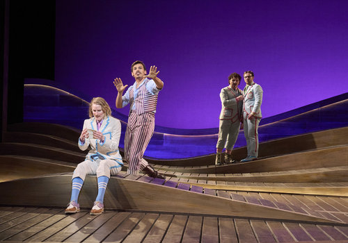 Orsino (actor, Jeremy Gallardo*) instructs Viola, now dressed as Cesario (actor, Greyson Heyl*), to deliver his love missive to his unrequited love, Olivia, as Valentine (actor, Boe Wank*) and Curio (actor, Evan Stevens*) look on in the Great Lakes Theater production of Twelfth Night at the Hanna Theatre, Playhouse Square, running through April 6. (Photo by Roger Mastroianni) *Member Actors' Equity Association, the Union of Professional Actors and Stage Managers in the United States