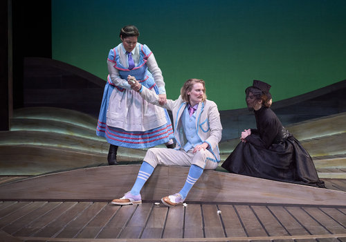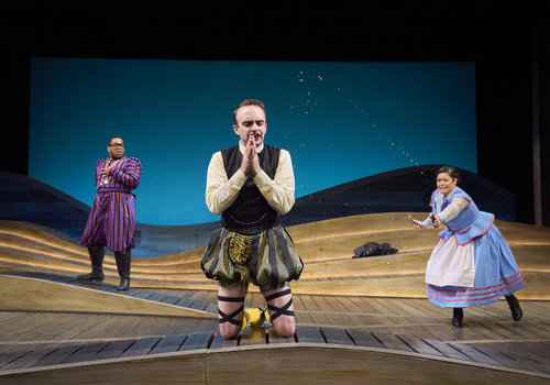 Sir Toby Belch (actor, Dar’Jon Marquise Bentley), Sir Andrew Aguecheek (actor, James Alexander Rankin*) and Maria (actor, Jessie Cope Miller*) ready themselves for the next step in their plan in the Great Lakes Theater production of Twelfth Night at the Hanna Theatre, Playhouse Square, running through April 6. (Photo by Roger Mastroianni) *Member Actors' Equity Association, the Union of Professional Actors and Stage Managers in the United States