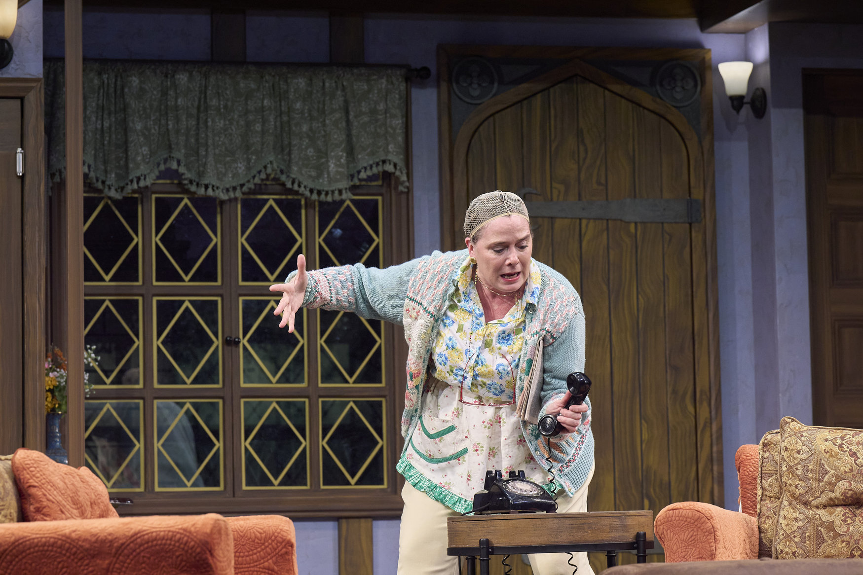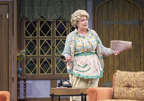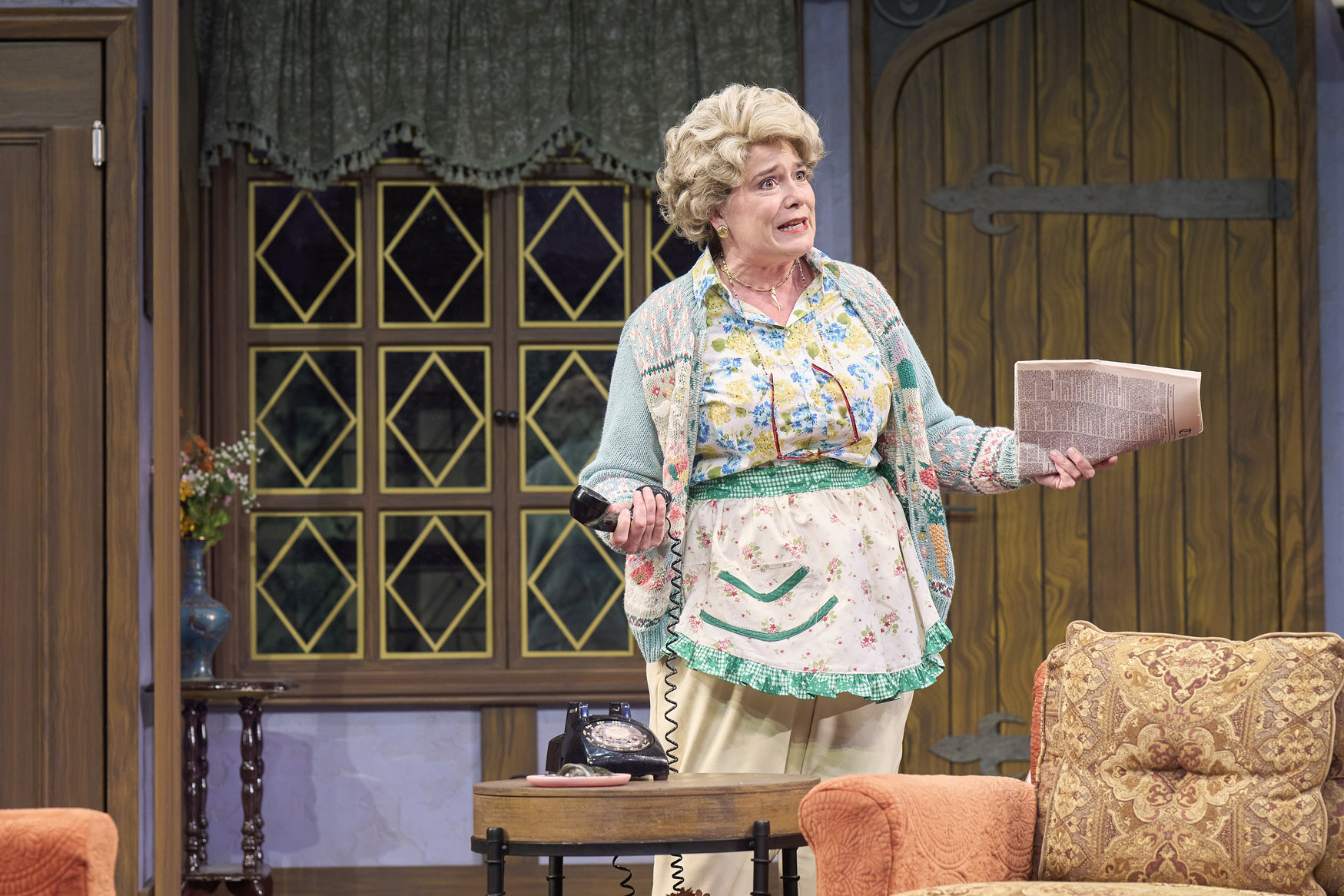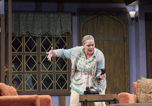 Dotty (actor, Jennifer Joplin*) rehearses the first scene of the play-within-the-play in the Great Lakes Theater production of Noises Off at the Hanna Theatre, Playhouse Square, running through May 18. (Photo by Roger Mastroianni)