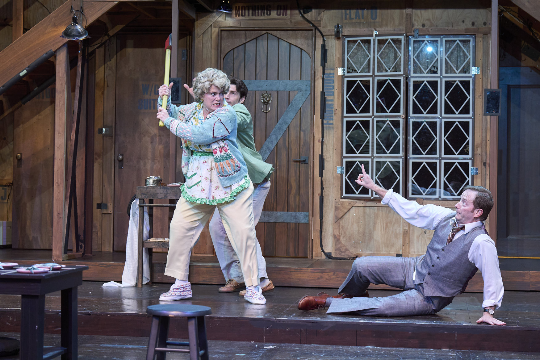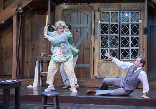 Tensions boil over as Dotty (actor, Jennifer Joplin*) threatens Gary (actor, Jeffrey C. Hawkins*) while Freddie (actor, Nick Steen*) tries to prevent catastrophe in the Great Lakes Theater production of Noises Off at the Hanna Theatre, Playhouse Square, running through May 18. (Photo by Roger Mastroianni)