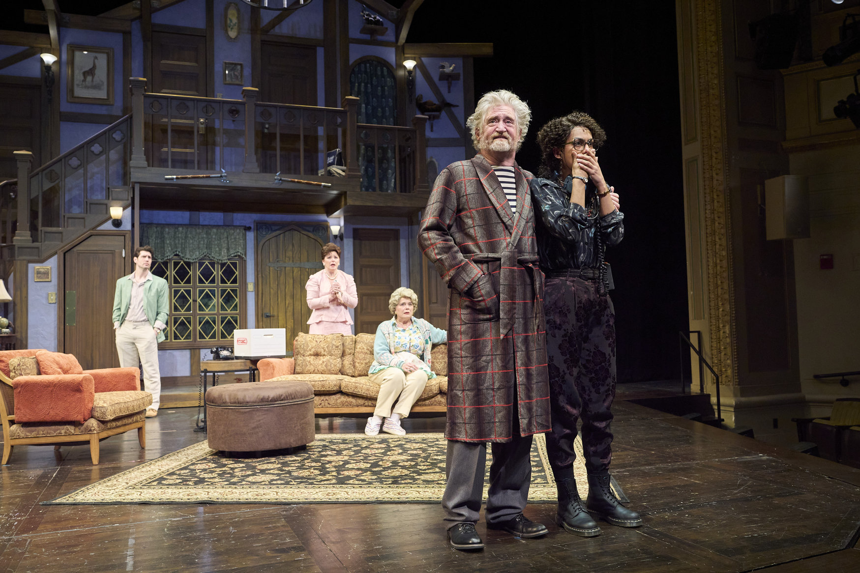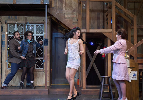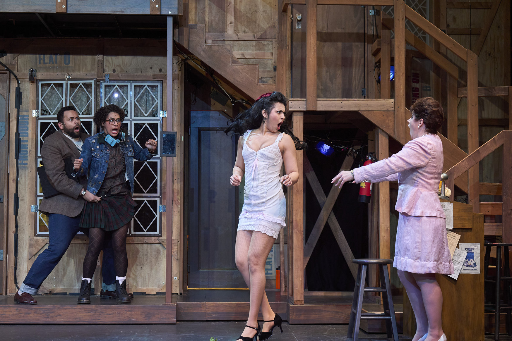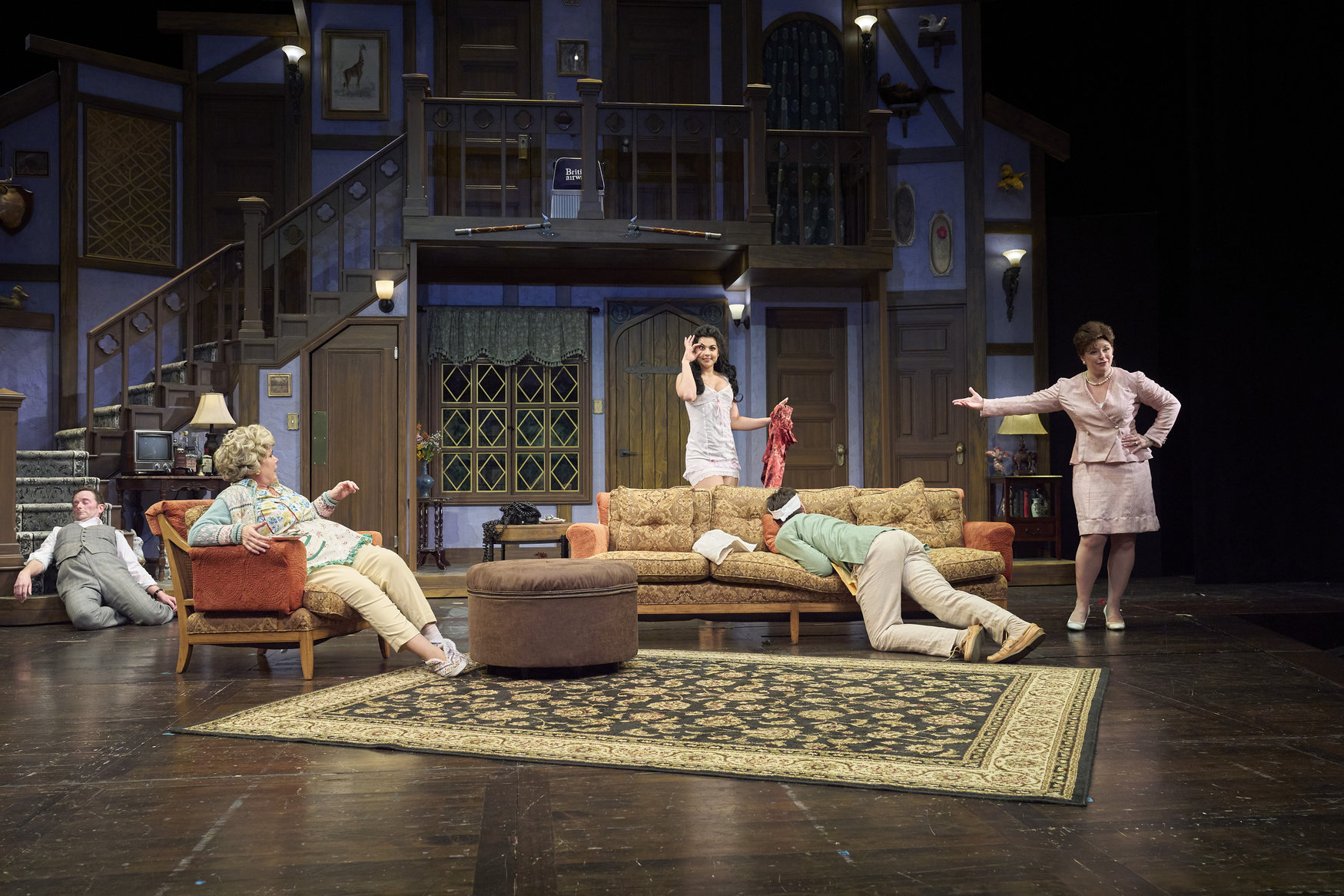 Brooke (actor, Kinza Surani*), as Vicki, is caught in her underthings as the cast (actors from left to right, David Anthony Smith*, Jennifer Joplin*, Laura Welsh* and Jeffrey C. Hawkins*) get close to the end of the final rehearsal in the Great Lakes Theater production of Noises Off at the Hanna Theatre, Playhouse Square, running through May 18. (Photo by Roger Mastroianni)