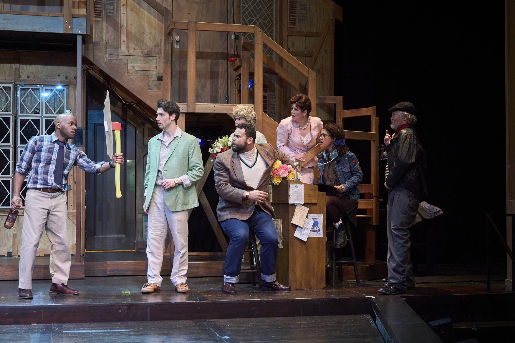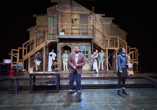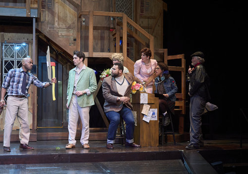 As the final scene looms, Freddie (actor, Nick Steen*) gets some direction from Lloyd (actor, Topher Embrey*) as the rest of the cast (actors from left to right, Jeffrey C. Hawins*, Laura Welsh*, Jennifer Joplin*, David Anthony Smith*, Domonique Champion* and Kinza Surani*) patiently wait in the Great Lakes Theater production of Noises Off at the Hanna Theatre, Playhouse Square, running through May 18. (Photo by Roger Mastroianni)