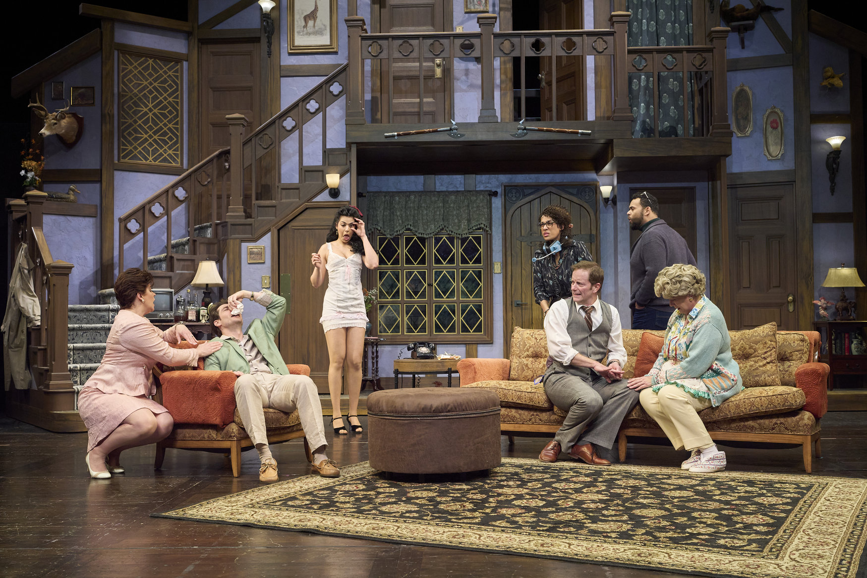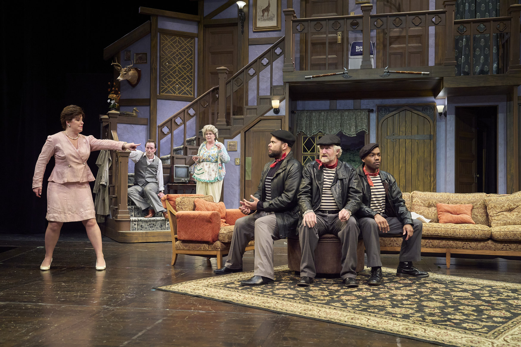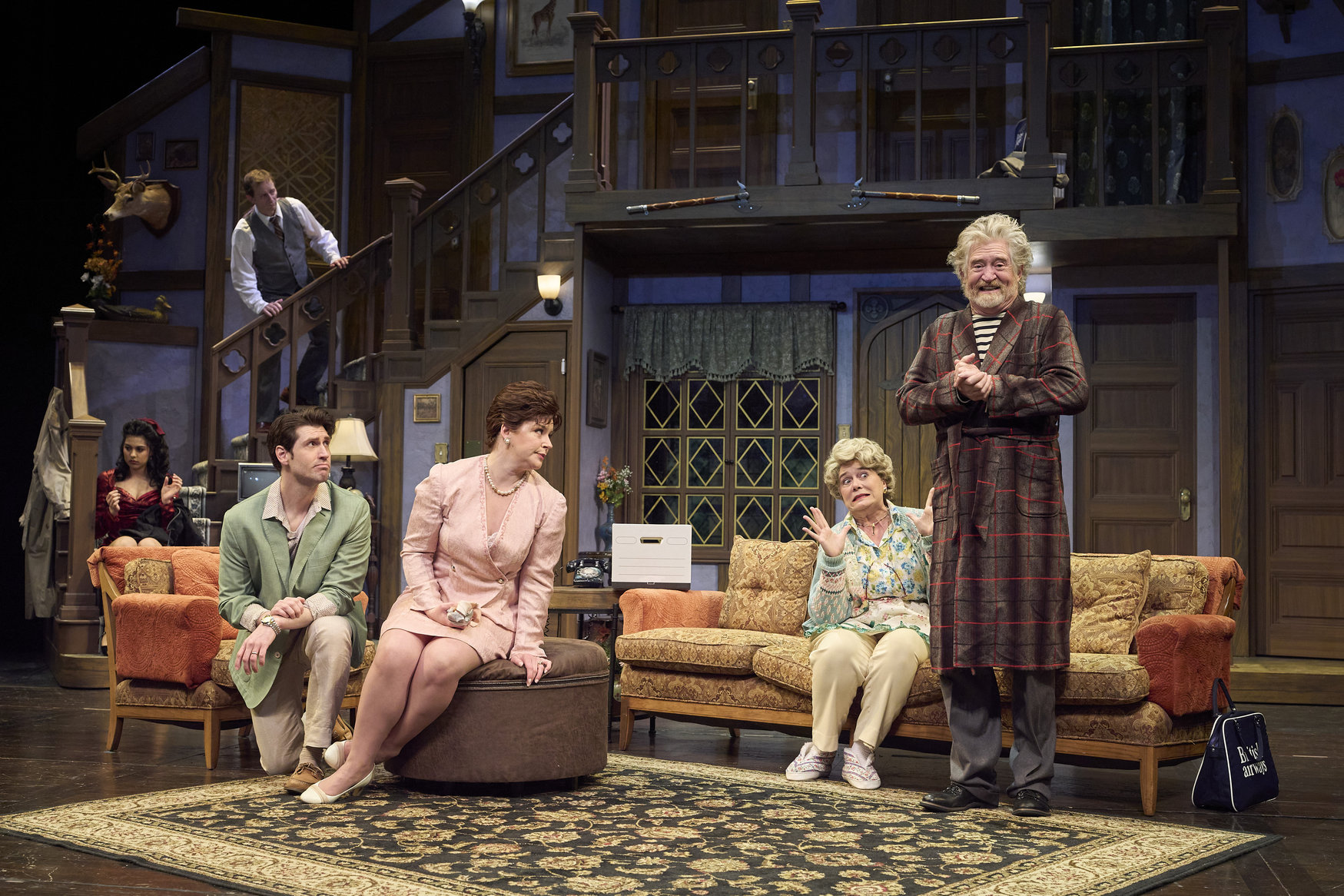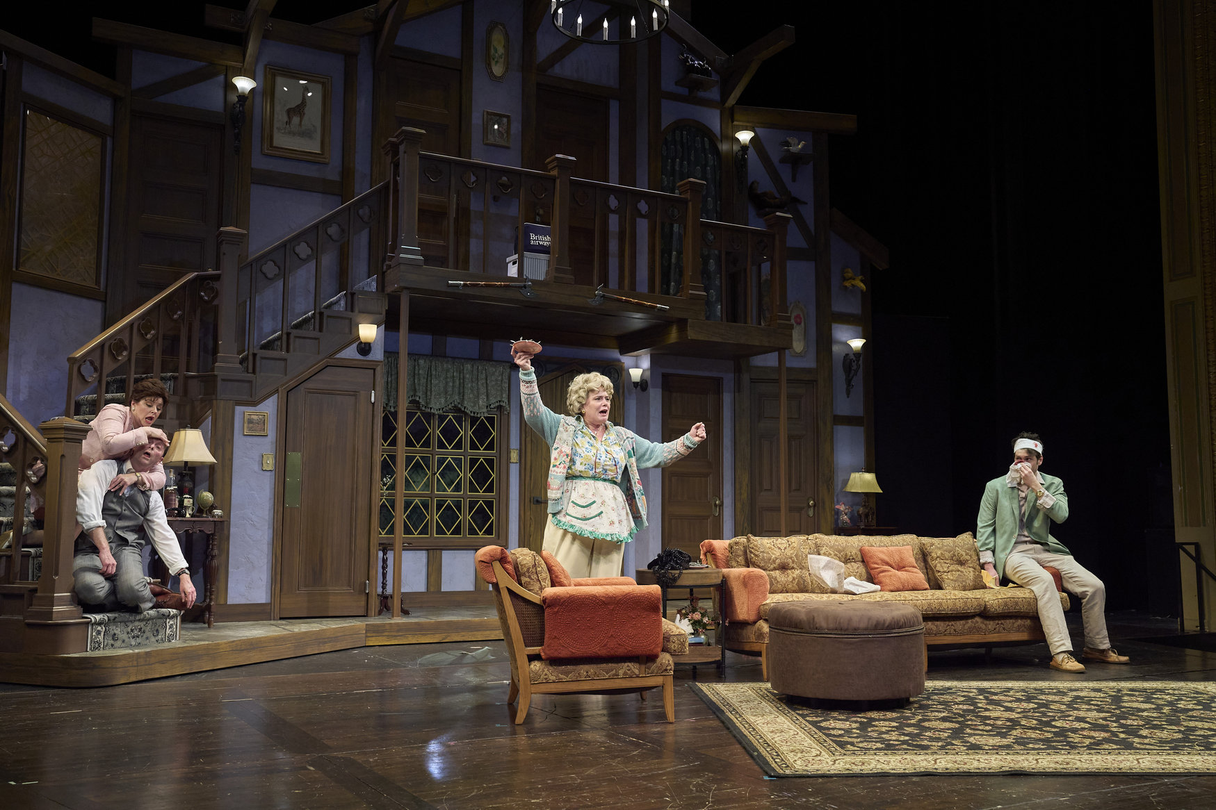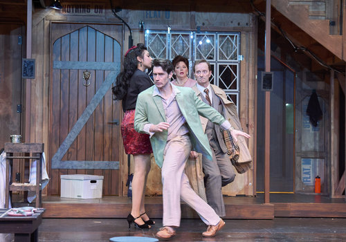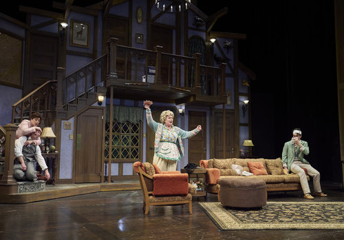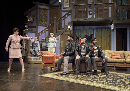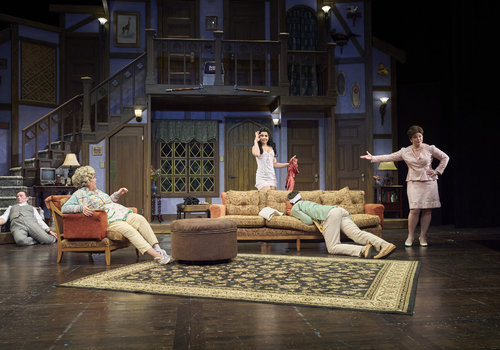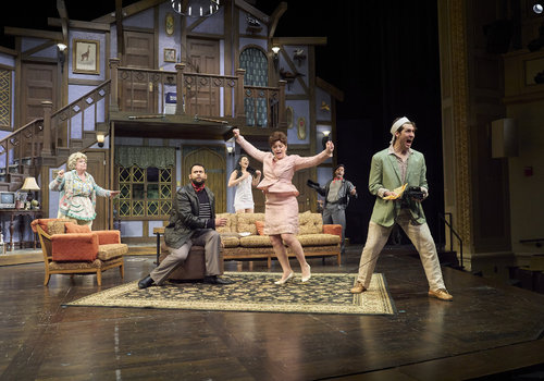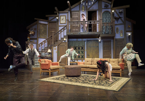 After searching around town, Poppy (actor, Zoë Lewis-McLean*) has just discovered Selsdon (actor, David Anthony Smith*) has returned while Freddie (actor, Nick Steen*), Belinda (actor, Laura Welsh*) and Dotty (actor, Jennifer Joplin*) look on in the Great Lakes Theater production of Noises Off at the Hanna Theatre, Playhouse Square, running through May 18. (Photo by Roger Mastroianni)