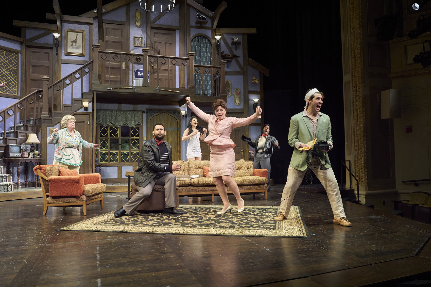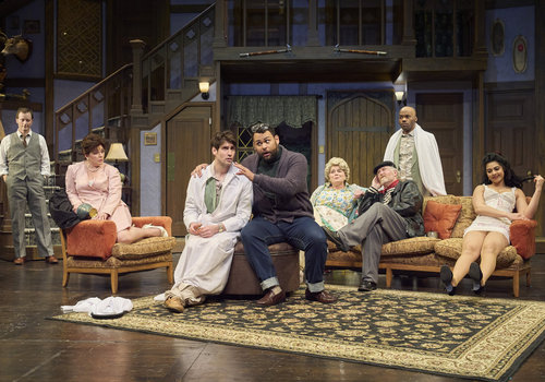 Selsdon (actor, David Anthony Smith*) has been found much to the relief of the cast (actors from left to right, Kinza Surani*, Jeffrey C. Hawkins*, Nick Steen*, Laura Welsh* and Jennifer Joplin*) in the Great Lakes Theater production of Noises Off at the Hanna Theatre, Playhouse Square, running through May 18. (Photo by Roger Mastroianni)