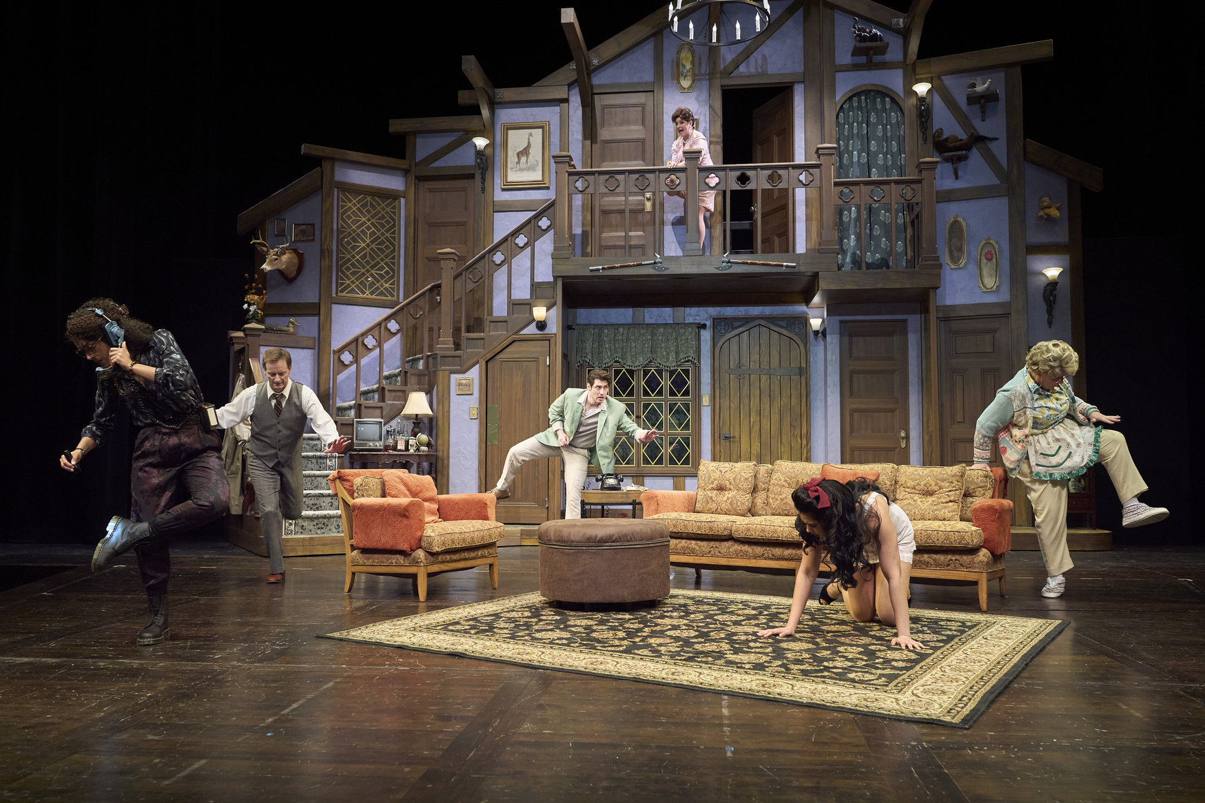 Belinda (actor, Laura Welsh*) triumphantly encourages her fellow actors (actors from left to right, Jennifer Joplin*, Kinza Surani*, Domonique Champion* and Nick Steen*) to execute the directions received from Lloyd (actor, Topher Embrey*) in the Great Lakes Theater production of Noises Off at the Hanna Theatre, Playhouse Square, running through May 18. (Photo by Roger Mastroianni)