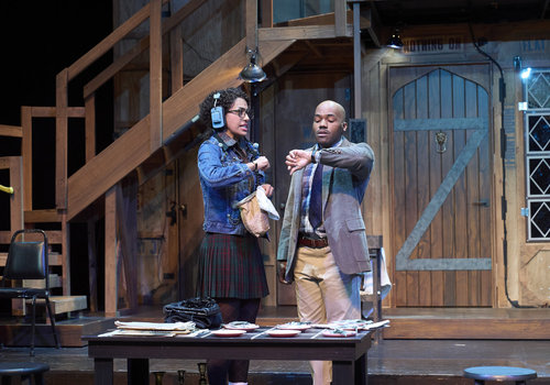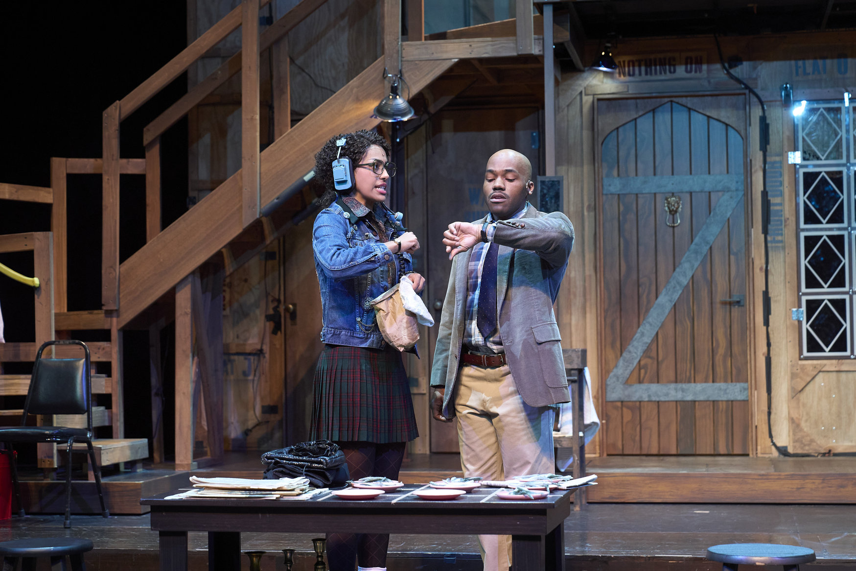 Poppy (actor, Zoë Lewis-McLean*) and Tim (actor, Domonique Champion*) check the time during pre-show in the Great Lakes Theater production of Noises Off at the Hanna Theatre, Playhouse Square, running through May 18. (Photo by Roger Mastroianni)