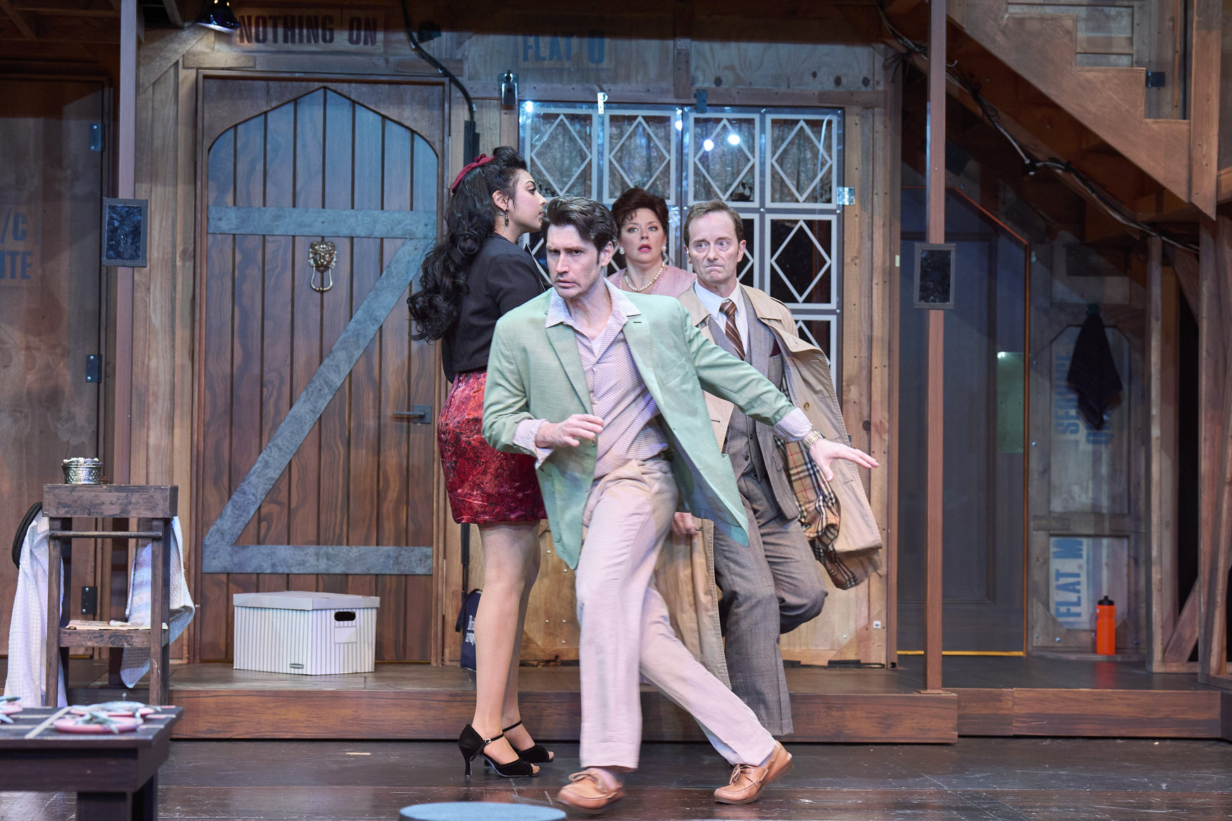 Brooke (actor, Kinza Surani*) discovers Lloyd (actor, Topher Embrey*) and Poppy (actor, Zoë Lewis-McLean*) in a compromising situation as Belinda (actor, Laura Welsh*) tries to smooth it over in the Great Lakes Theater production of Noises Off at the Hanna Theatre, Playhouse Square, running through May 18. (Photo by Roger Mastroianni)