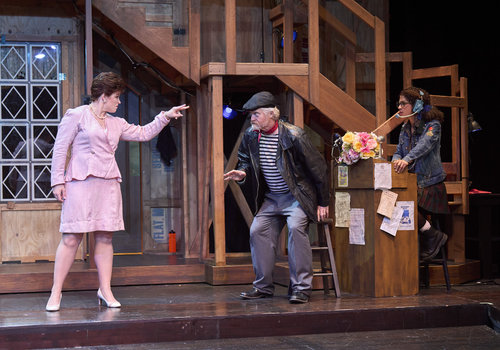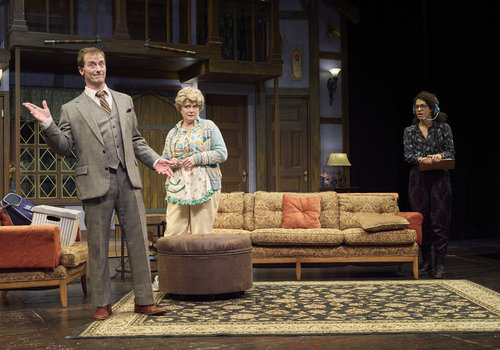 Gary (actor, Jeffrey C. Hawkins*) has a question about the scene as Dotty (actor, Jennifer Joplin*) and Poppy (actor, Zoë Lewis-McLean*) look on in the Great Lakes Theater production of Noises Off at the Hanna Theatre Playhouse Square, running through May 18. (Photo by Roger Mastroianni)