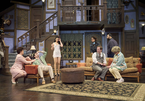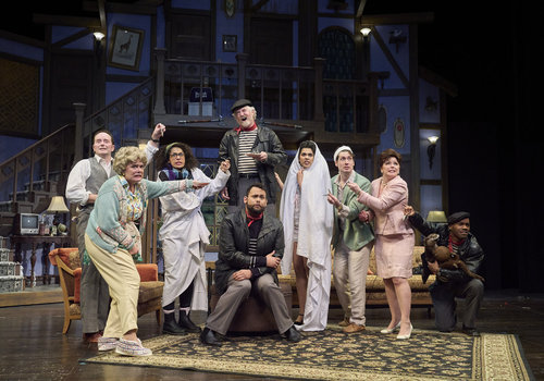 The search for the contact has left a large wake of disaster for the cast and director (actors from left to right, Laura Welsh*, Nick Steen*, Kinza Surani*, Zoë Lewis-McLean*, Jeffrey C. Hawkins*, Topher Embrey* and Jennifer Joplin*) in the Great Lakes Theater production of Noises Off at the Hanna Theatre, Playhouse Square, running through May 18. (Photo by Roger Mastroianni)