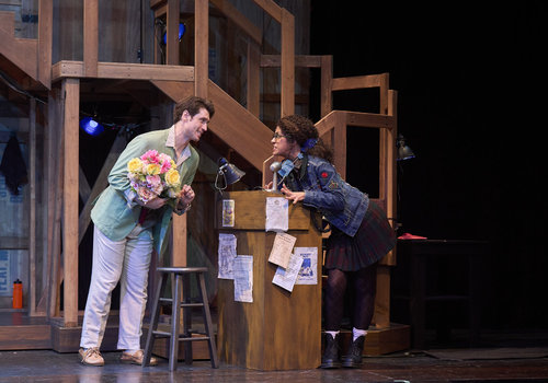 Freddie (actor, Nick Steen*) tries to help Poppy (actor, Zoë Lewis-McLean*) with the front-of-house calls in the Great Lakes Theater production of Noises Off at the Hanna Theatre, Playhouse Square, running through May 18. (Photo by Roger Mastroianni)