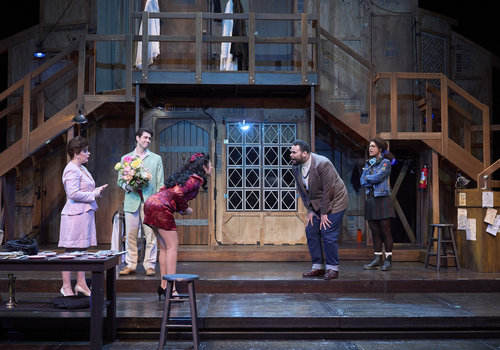 Brooke (actor, Kinza Surani*) discovers Lloyd (actor, Topher Embrey*) has visited the cast on tour as the rest of the team (actors, from left to right, Laura Welsh*, Nick Steen* and Zoë Lewis-McLean*) look on in the Great Lakes Theater production of Noises Off at the Hanna Theatre, Playhouse Square, running through May 18. (Photo by Roger Mastroianni)