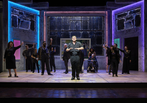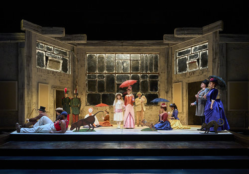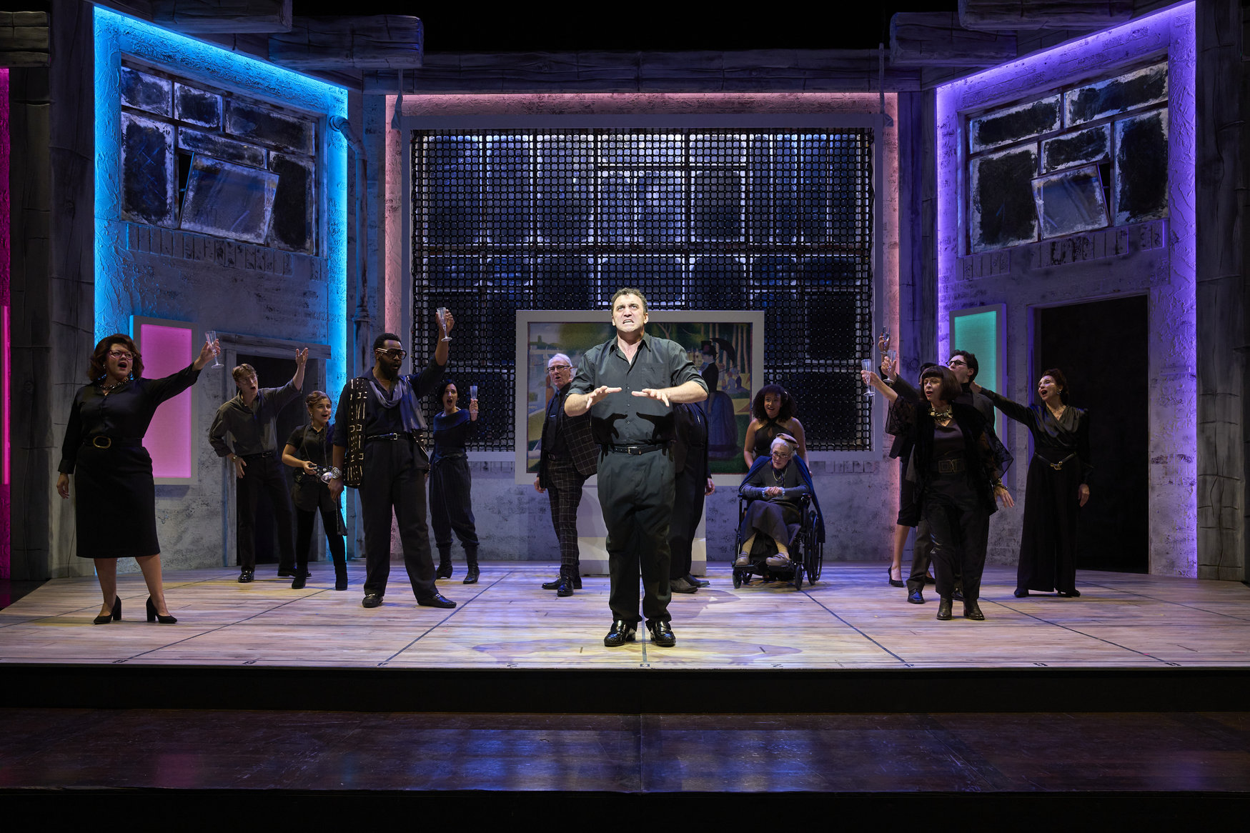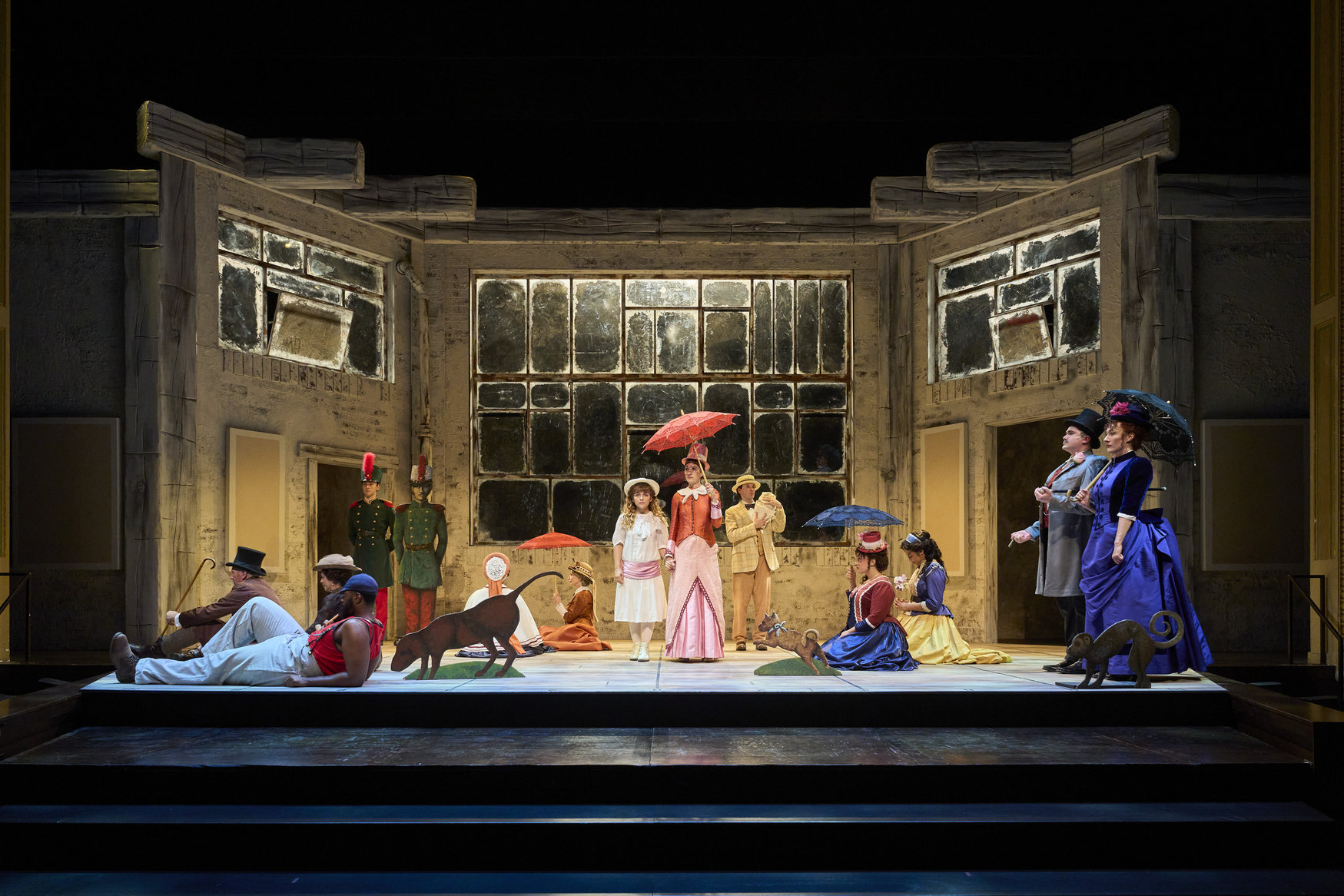 George's subjects (actors from l to r, Brian Sutherland,* Diane Sutherland,* Elijah Dawson,* Ethan Flanagan, Jessie Cope Miller,* Laura Perrotta,* Mia Cabrera, Jodi Dominick,* Elliot Block,* Amber Hurst-Martin,* Kinza Surani,* Ben Senneff* and Jillian Kates*) create A Sunday Afternoon on the Island of Le Grande Jatte in the Great Lakes Theater production of Sunday in the Park with George at the Hanna Theatre, Playhouse Square, running through October 12. (Photo by Roger Mastroianni)