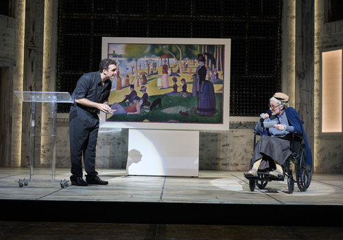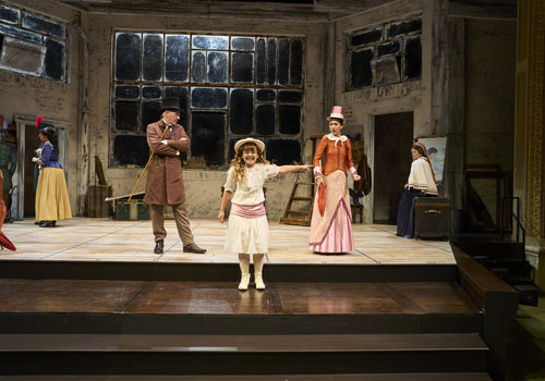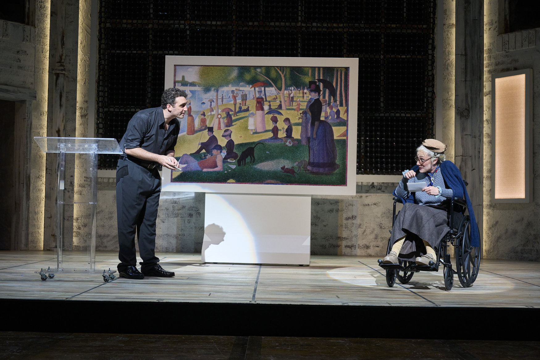 George (actor, Alex Syiek*) and Marie (actor, Jillian Kates*) present their familial ties to Seurat and his famous painting in the Great Lakes Theater production of Sunday in the Park with George at the Hanna Theatre, Playhouse Square, running through October 12. (Photo by Roger Mastroianni)