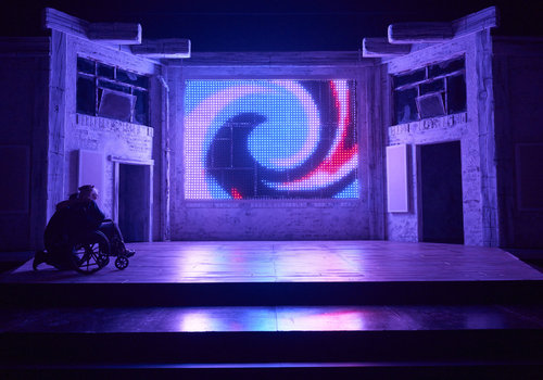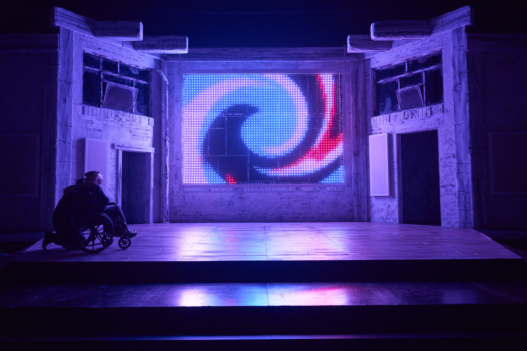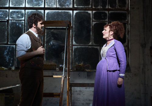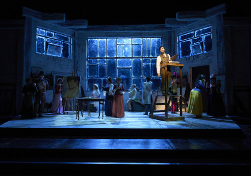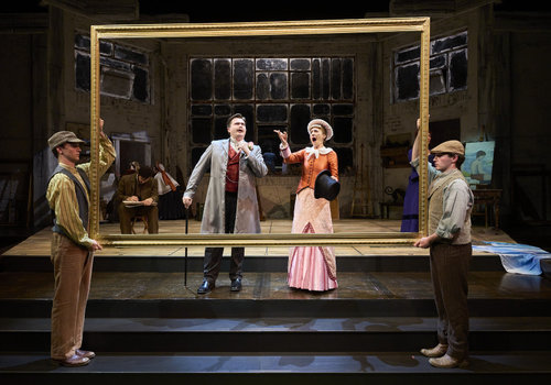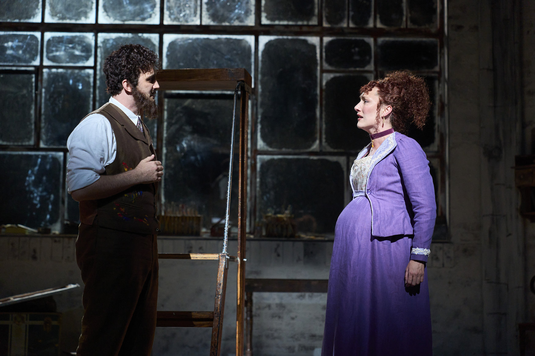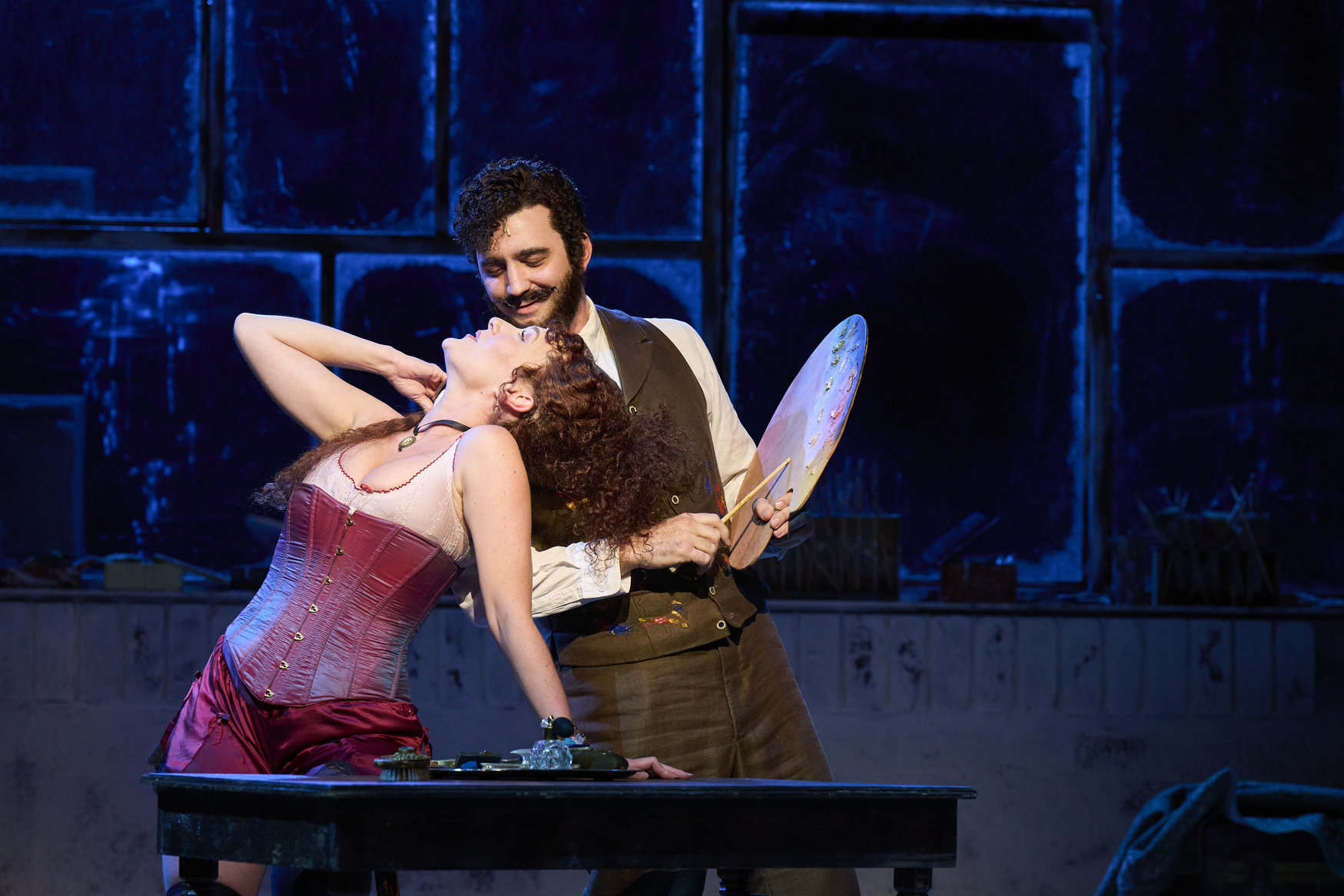 George's latest Chromolume is shown as George (actor, Alex Syiek*) and Marie (actor, Jillian Kates*) get a front row seat in the Great Lakes Theater production of Sunday in the Park with George at the Hanna Theatre, Playhouse Square, running through October 12. (Photo by Roger Mastroianni)