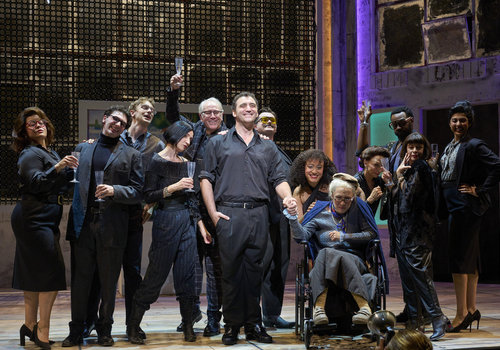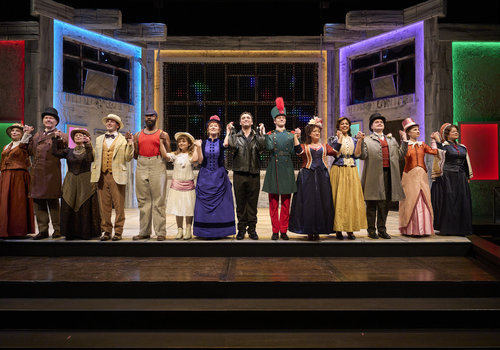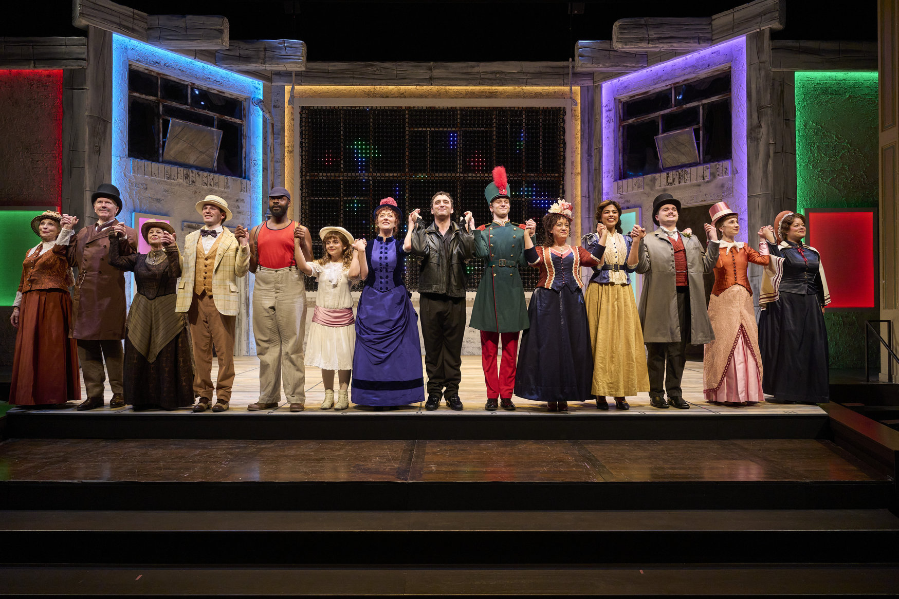 The cast (actors from l to r, Laura Perrotta,* Brian Sutherland,* Diane Sutherland,* Elliot Block,* Elijah Dawson,* Mia Cabrera, Jillian Kates,* Alex Syiek,* Ethan Flanagan, Amber Hurst-Martin,* Kinza Surani,* Ben Senneff,* Jodi Dominick* and Jessie Cope Miller) take a bow in the Great Lakes Theater production of Sunday in the Park with George at the Hanna Theatre, Playhouse Square, running through October 12. (Photo by Roger Mastroianni) *Member Actors' Equity Association, the Union of Professional Actors and Stage Managers in the United States
