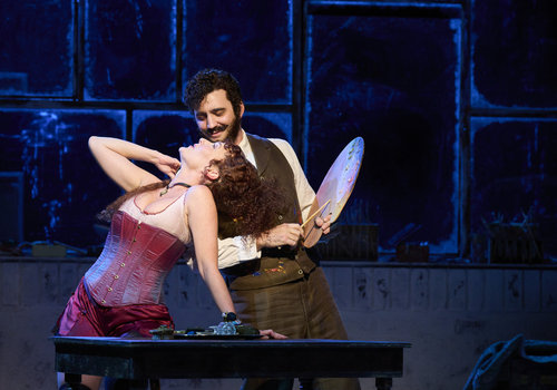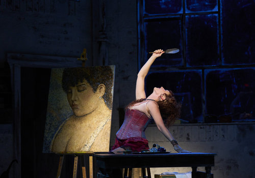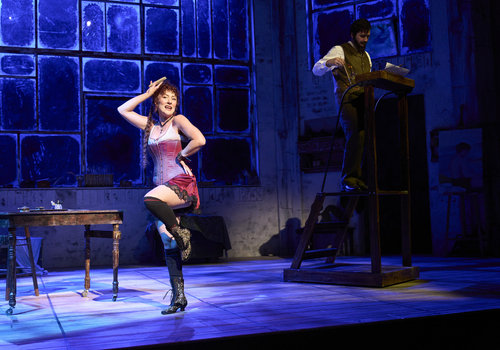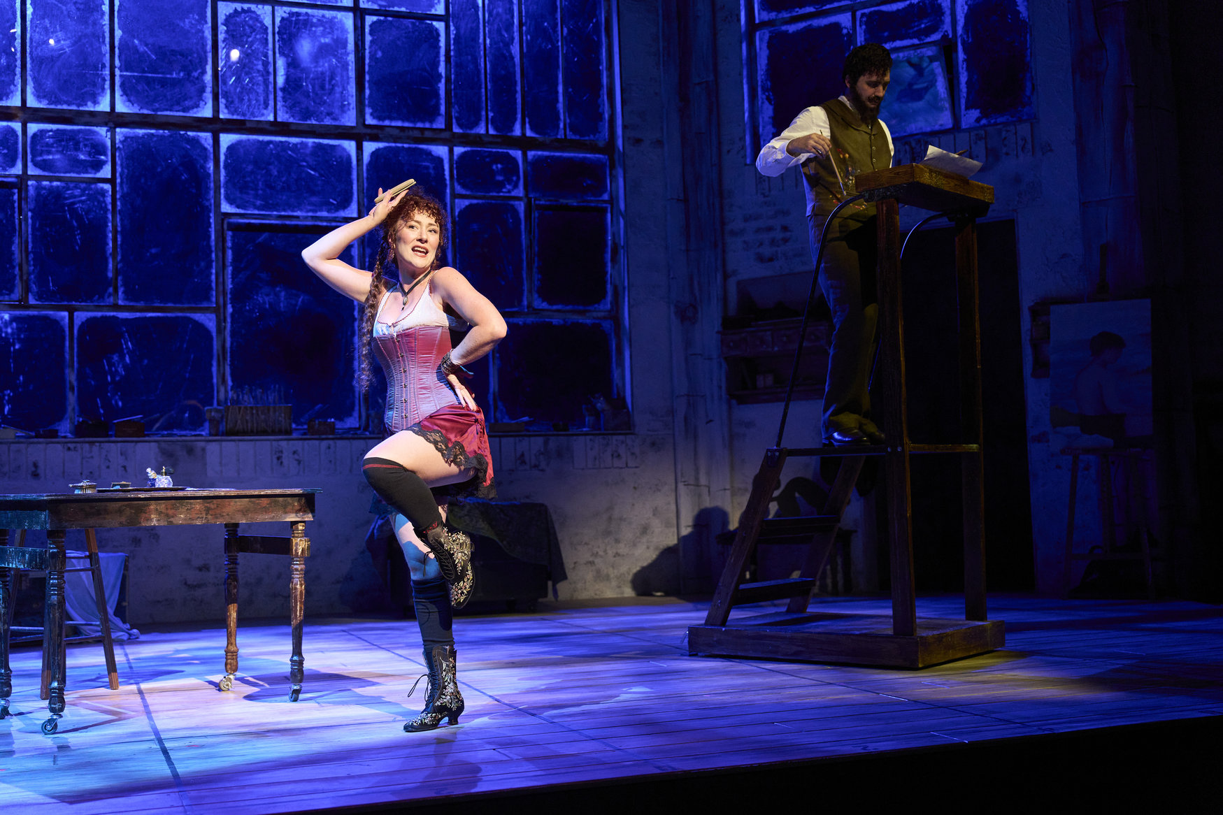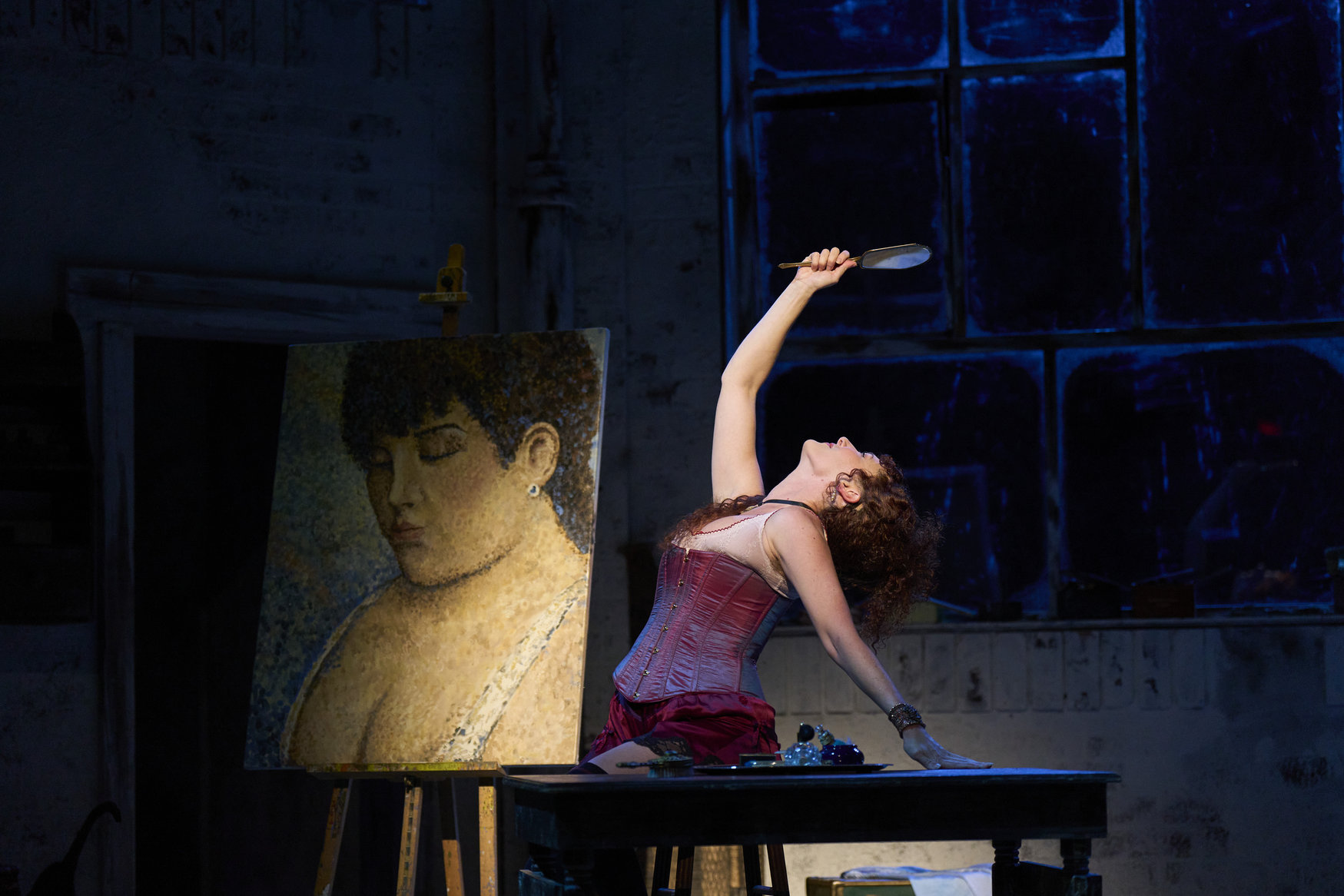 Dot (actor, Jillian Kates*) imagines what it would be like to be in the Follies as George (actor, Alex Syiek*) concentrates on his painting in the Great Lakes Theater production of Sunday in the Park with George at the Hanna Theatre, Playhouse Square, running through October 12. (Photo by Roger Mastroianni)
