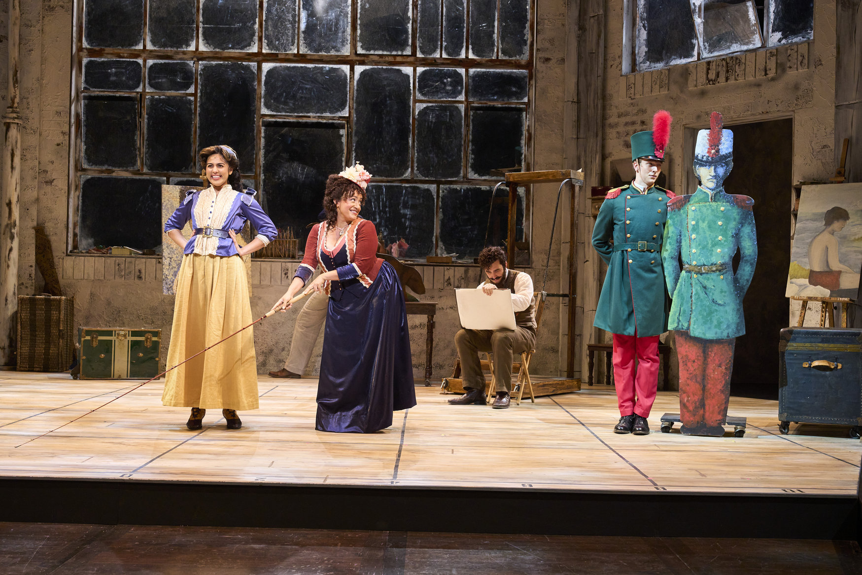 Celeste #2 (actor, Kinza Surani*) and Celeste #1 (actor, Amber Hurst-Martin*) try to catch the eye of the soldiers (actor, Ethan Flanagan) as George (actor, Alex Syiek*) observes in the Great Lakes Theater production of Sunday in the Park with George at the Hanna Theatre, Playhouse Square, running through October 12. (Photo by Roger Mastroianni)