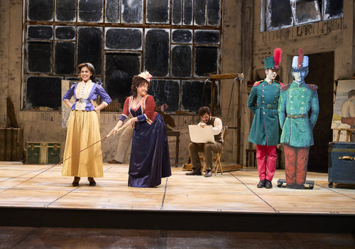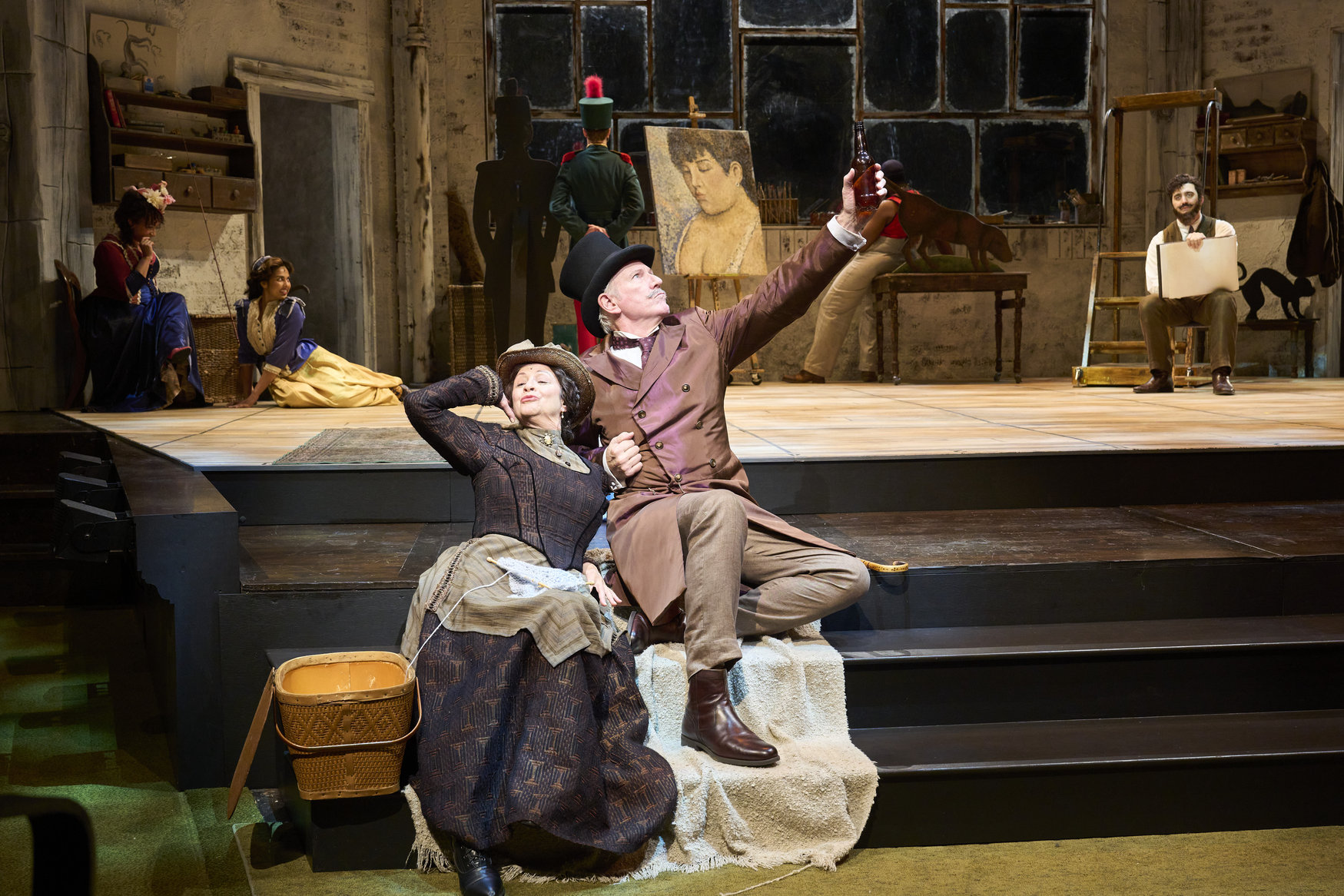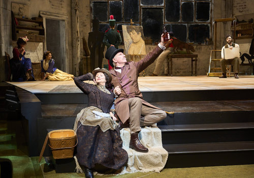 Frieda (actor, Diane Sutherland*) and Franz (actor, Brian Sutherland*) pose for George (actor, Alex Syiek*) as Celeste #2 (actor, Kinza Surani*) and Celeste #1 (actor, Amber Hurst-Martin*) watch the soldiers (actor, Ethan Flanagan) in the Great Lakes Theater production of Sunday in the Park with George at the Hanna Theatre, Playhouse Square, running through October 12. (Photo by Roger Mastroianni)