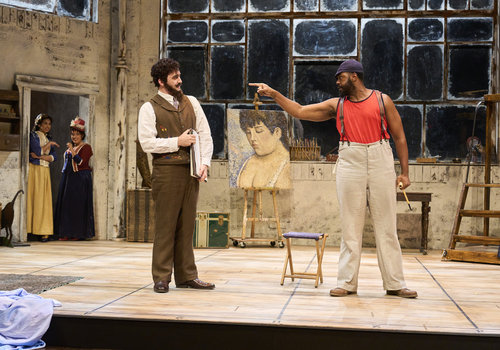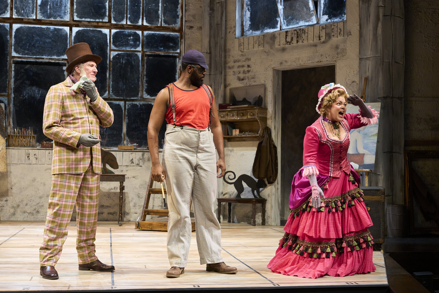 A boatman (actor, Elijah Dawson*) confronts George (actor, Alex Syiek*) as Celeste #2 (actor, Kinza Surani*) and Celeste #1 (actor, Amber Hurst-Martin*) look on in the Great Lakes Theater production of Sunday in the Park with George at the Hanna Theatre, Playhouse Square, running through October 12. (Photo by Roger Mastroianni)