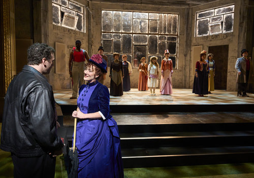 Finding inspiration from his ancestors, George (actor, Alex Syiek*) and Dot (actor, Jillian Kates*) share a moment in the Great Lakes Theater production of Sunday in the Park with George at the Hanna Theatre, Playhouse Square, running through October 12. Also featured from l to r, Elijah Dawson,* Brian Sutherland,* Diane Sutherland,* Jessie Cope Miller,* Laura Perrotta,* Mia Cabrera, Jodi Dominick,* Amber Hurst-Martin,* Kinza Surani* and Ben Senneff.* (Photo by Roger Mastroianni)