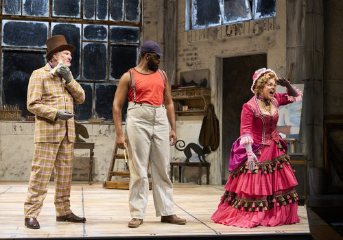 Mrs. (actor, Jessie Cope Miller*) looks across the river as the boatman (actor, Elijah Dawson*) and Mr. (actor, Brian Sutherland*) look on in the Great Lakes Theater production of Sunday in the Park with George at the Hanna Theatre, Playhouse Square, running through October 12. (Photo by Roger Mastroianni)
