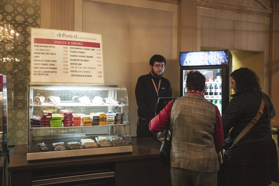 Yes! Our lobby concession stand offers a variety of treats, including candy, baked goods, soft pretzels, Coca-Cola products, bottled water, and coffee. Beer, wine and spirits are available at both this stand and the Tom Hanks & Rita Wilson Bar inside the theater. Food and beverages are welcome at your seat. Please enjoy them quietly to avoid disrupting the performance.